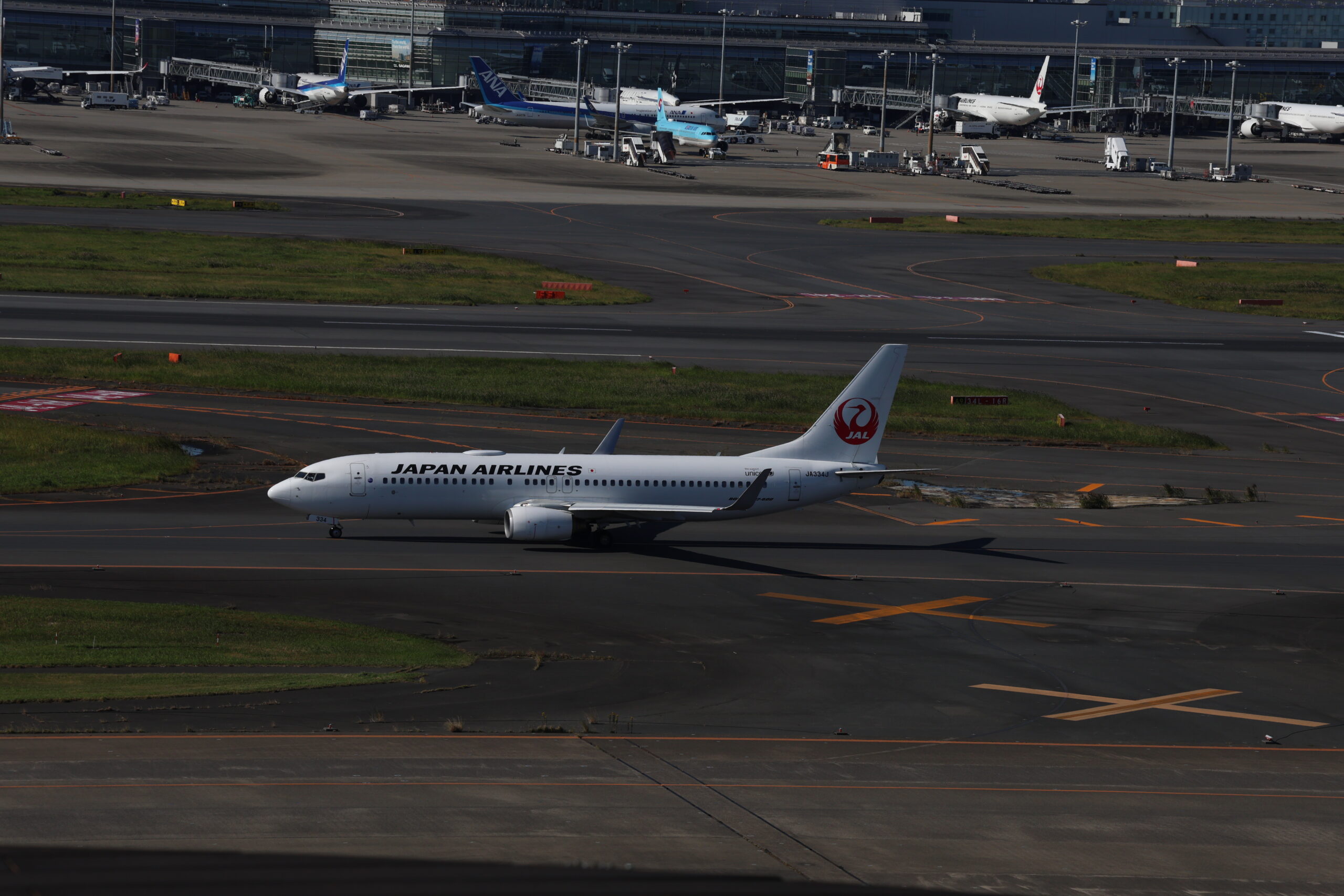 出発するJALのB737-800 JA334J。