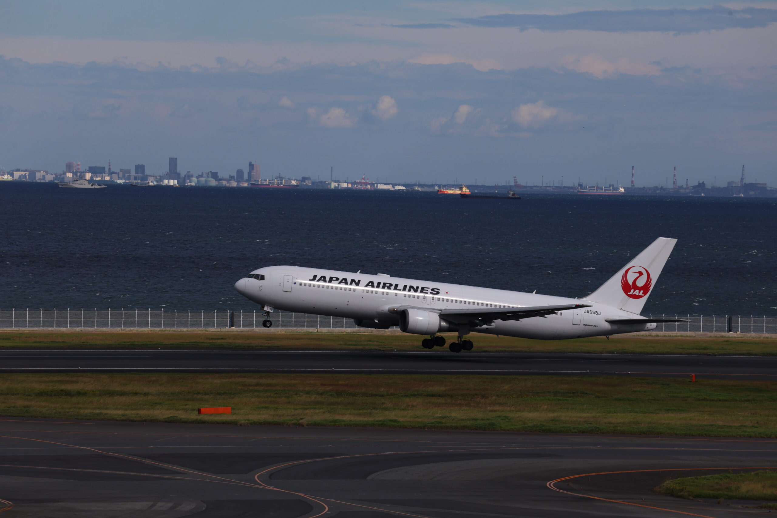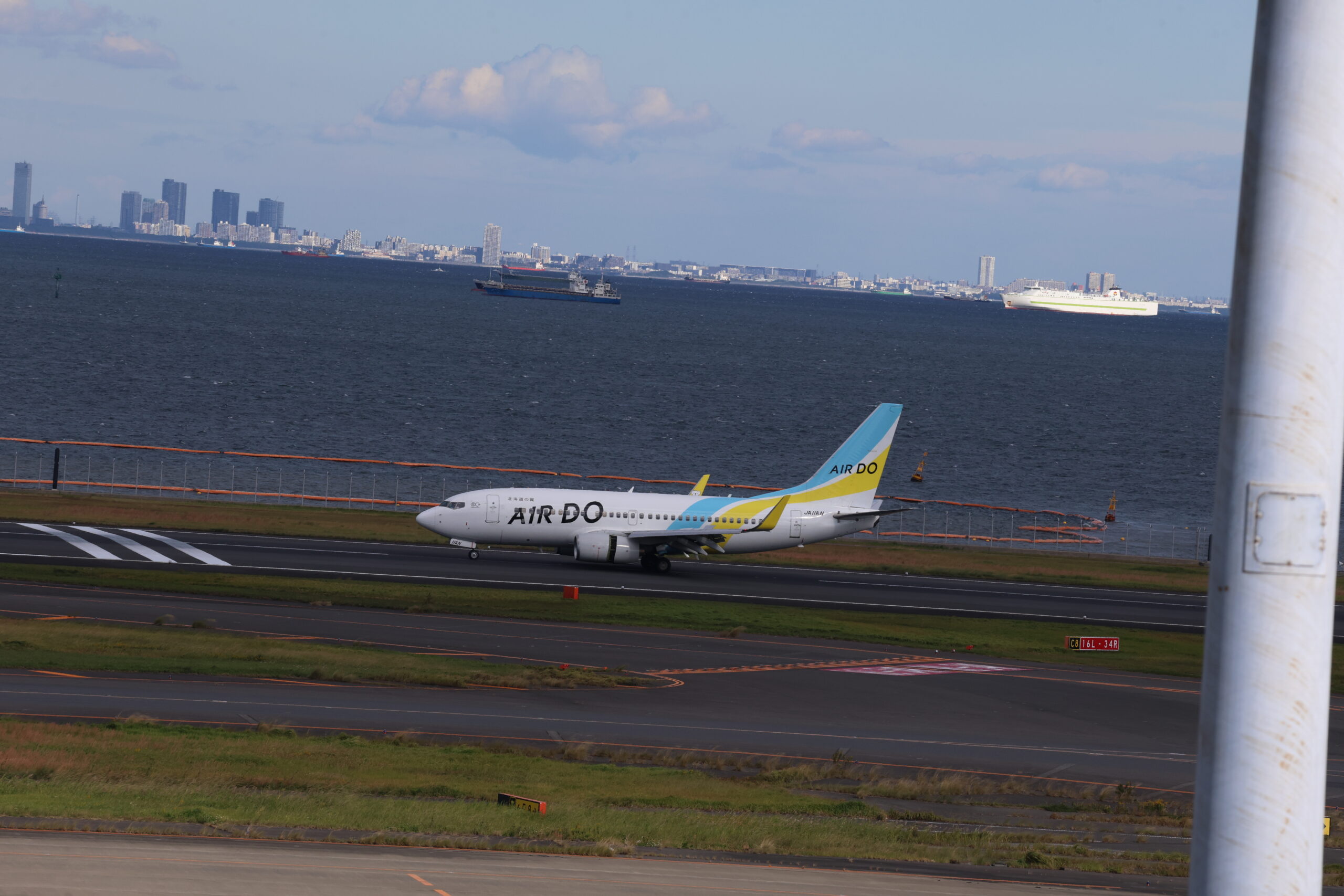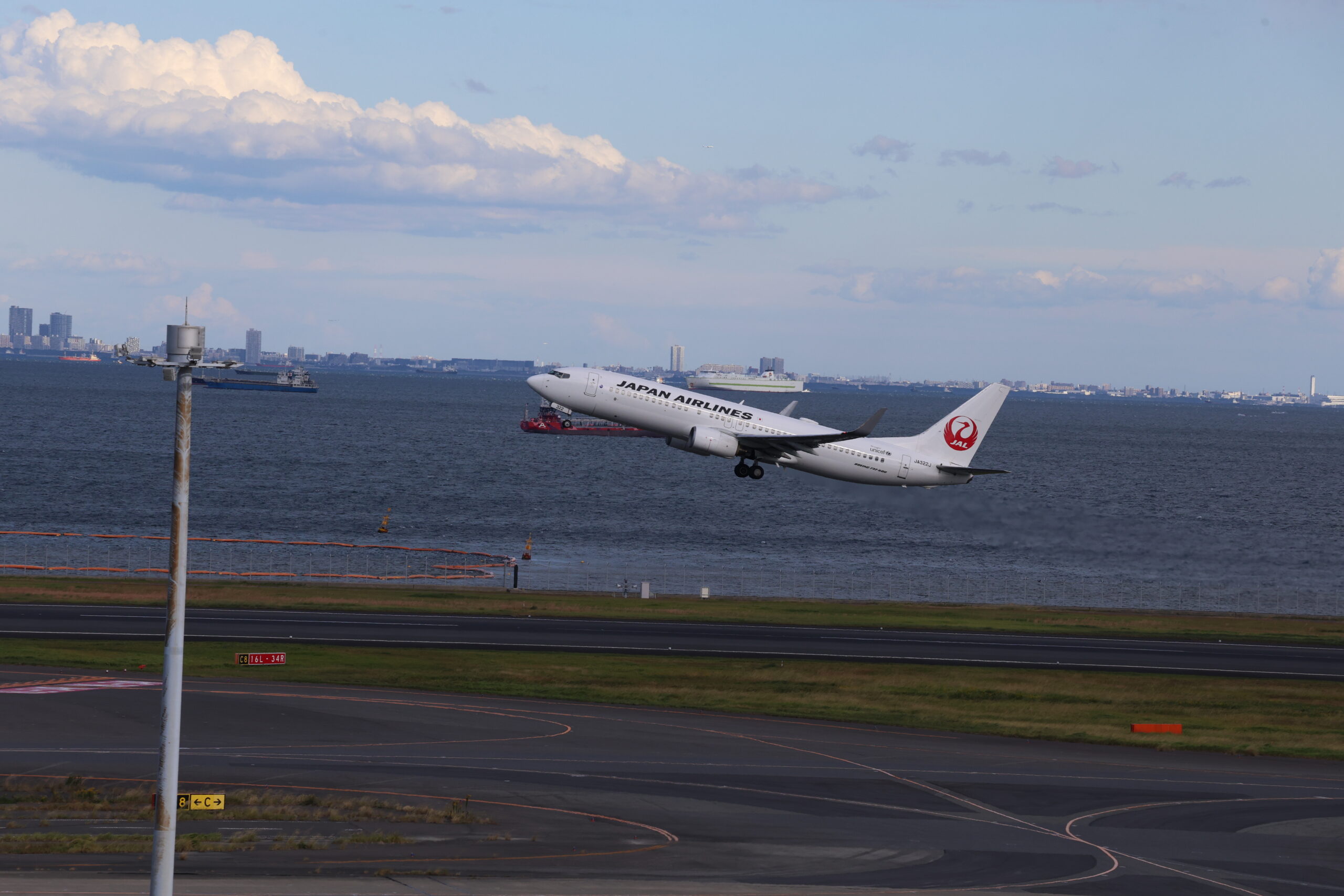 JAL B737-800 JA322J。バックに映るのは徳島と東京の有明港と福岡の新門司港を結ぶオーシャンフェリーの「フェリーりつりん」
