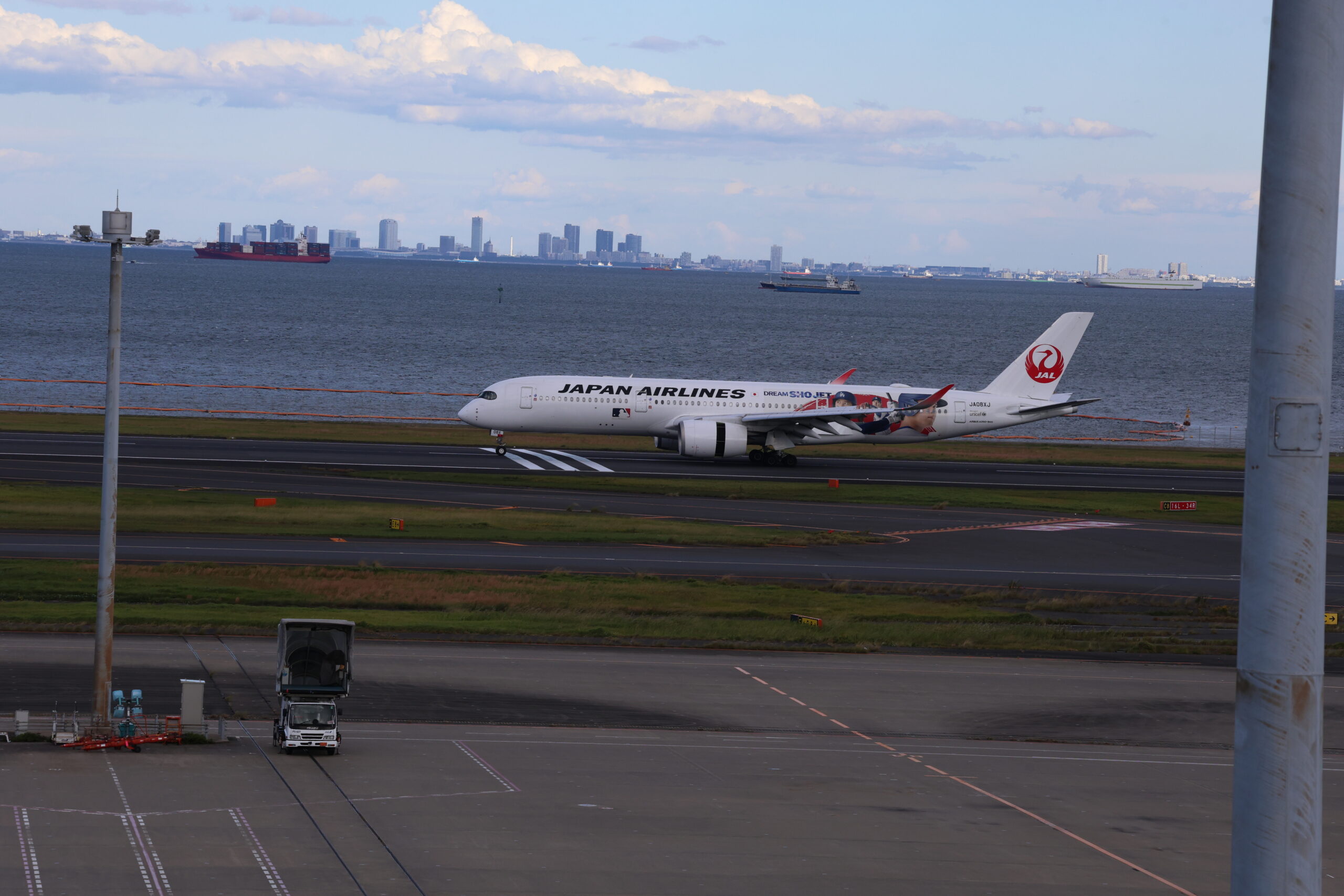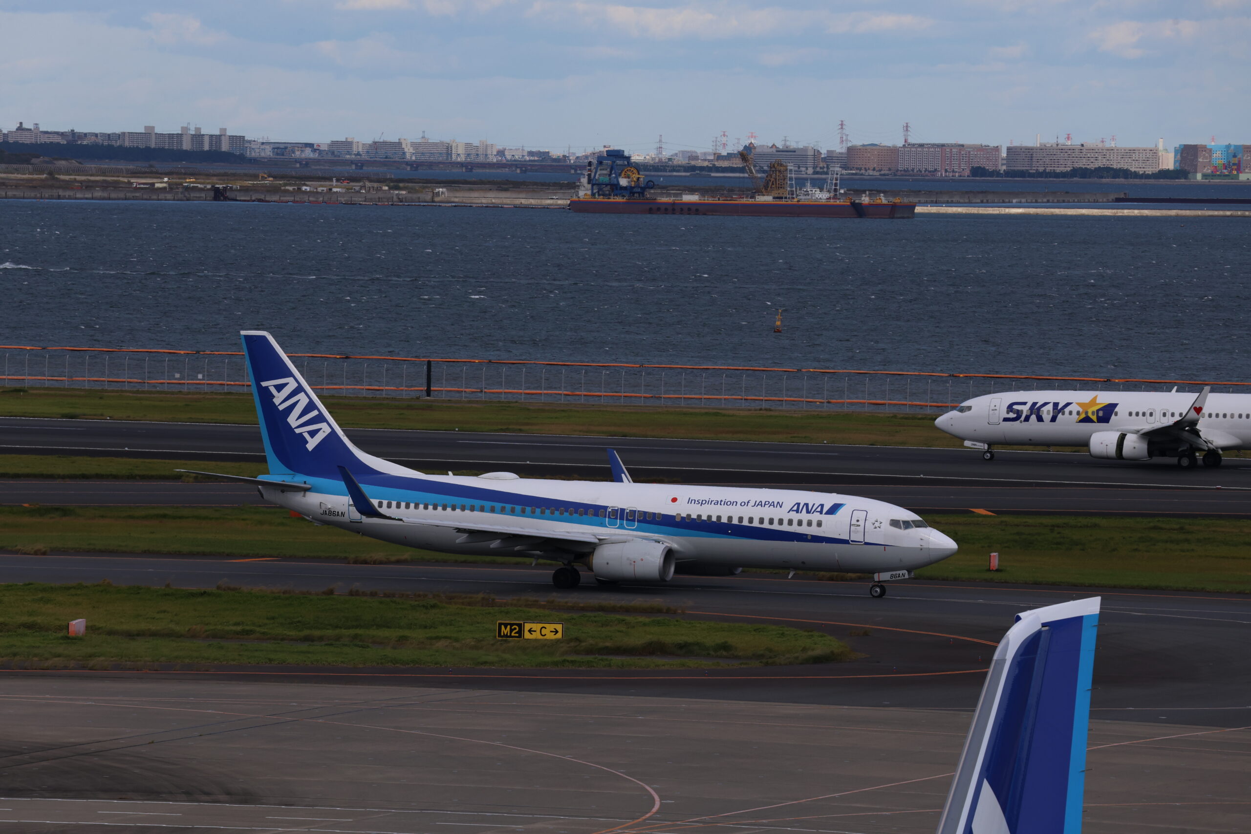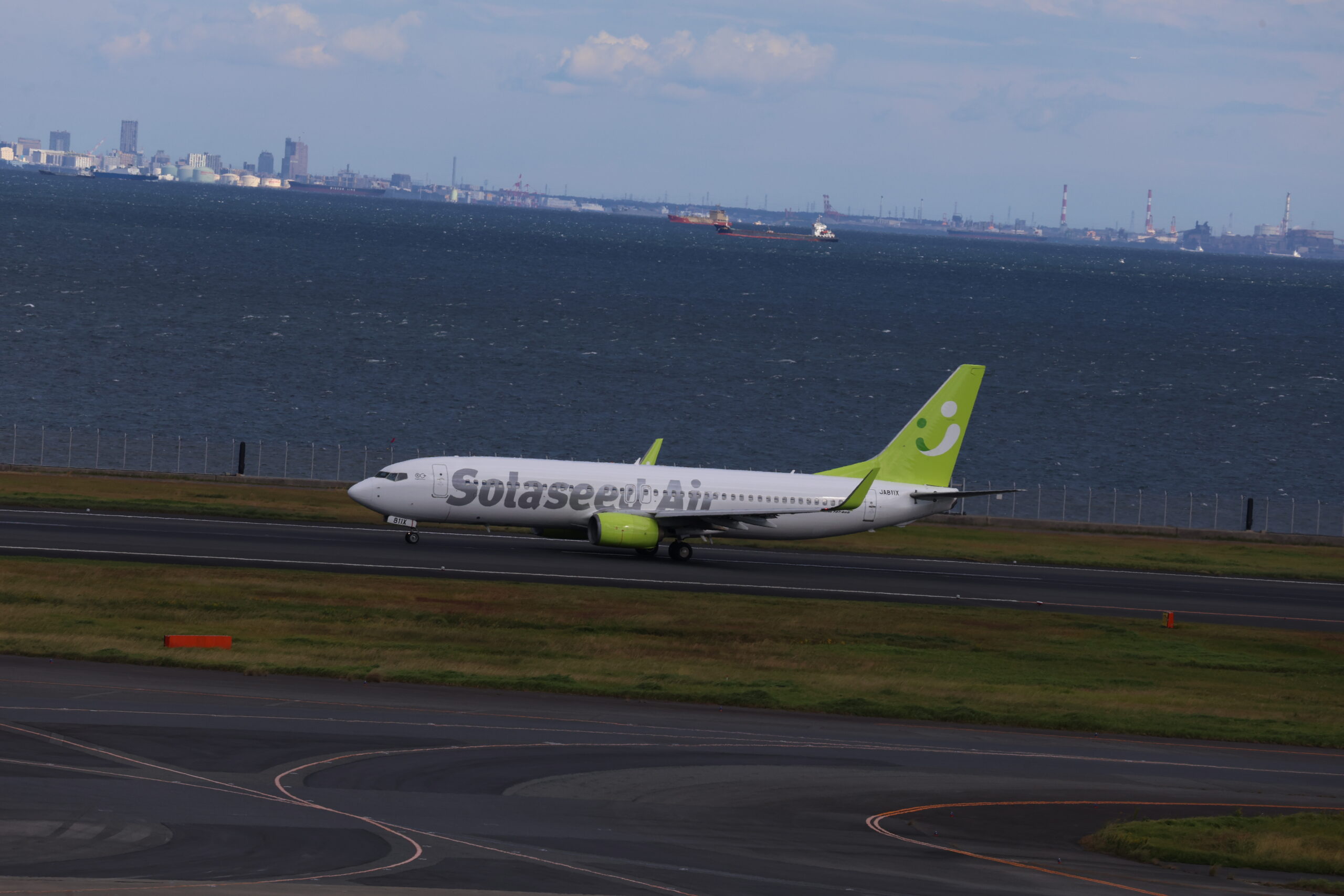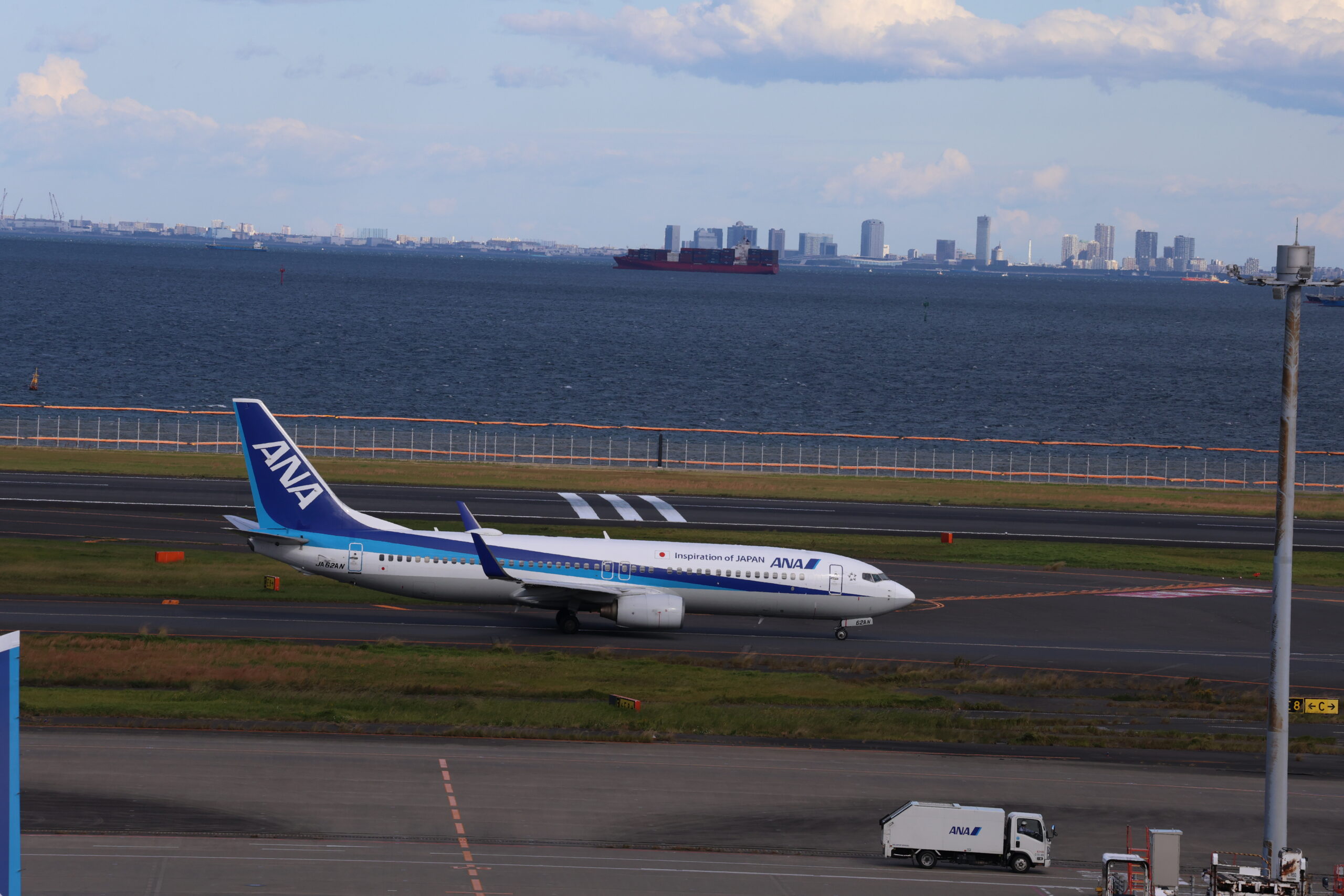 JAL B737-800 JA322J。バックに映るのは徳島と東京の有明港と福岡の新門司港を結ぶオーシャンフェリーの「フェリーりつりん」